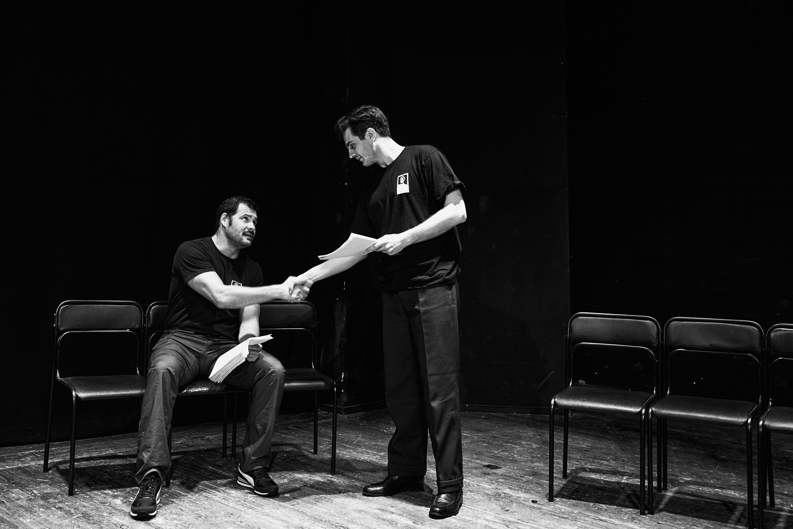Читка – не спектакль. Здесь нет декораций (только черный кабинет и шесть стульев), нет костюмов. Артисты выходят к зрителю с листами в руках и читают текст, проживая историю своих персонажей здесь и сейчас. Ремарки читал куратор читки, ведущий артист театра Дмитрий Керн. Некоторые зрители признавались: его голос воспринимался как голос погибшего Лютого, который незримо наблюдает за происходящим.