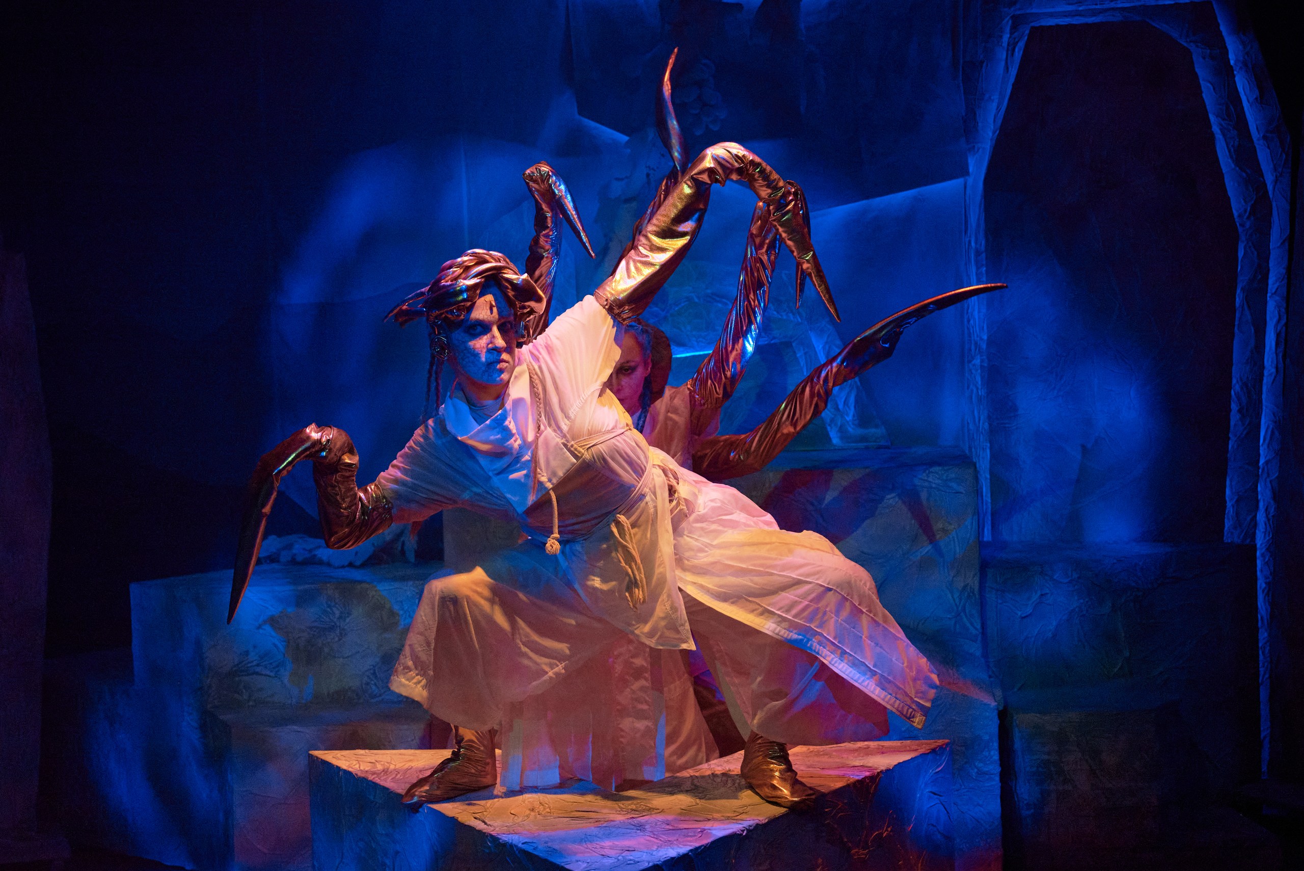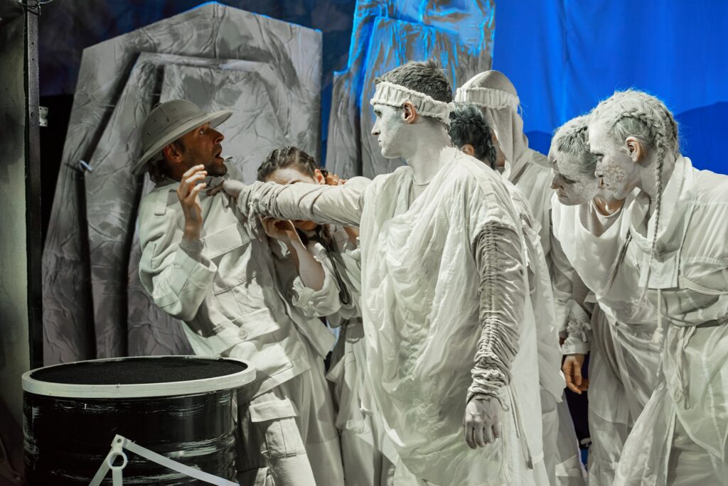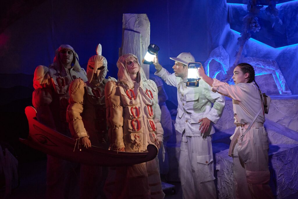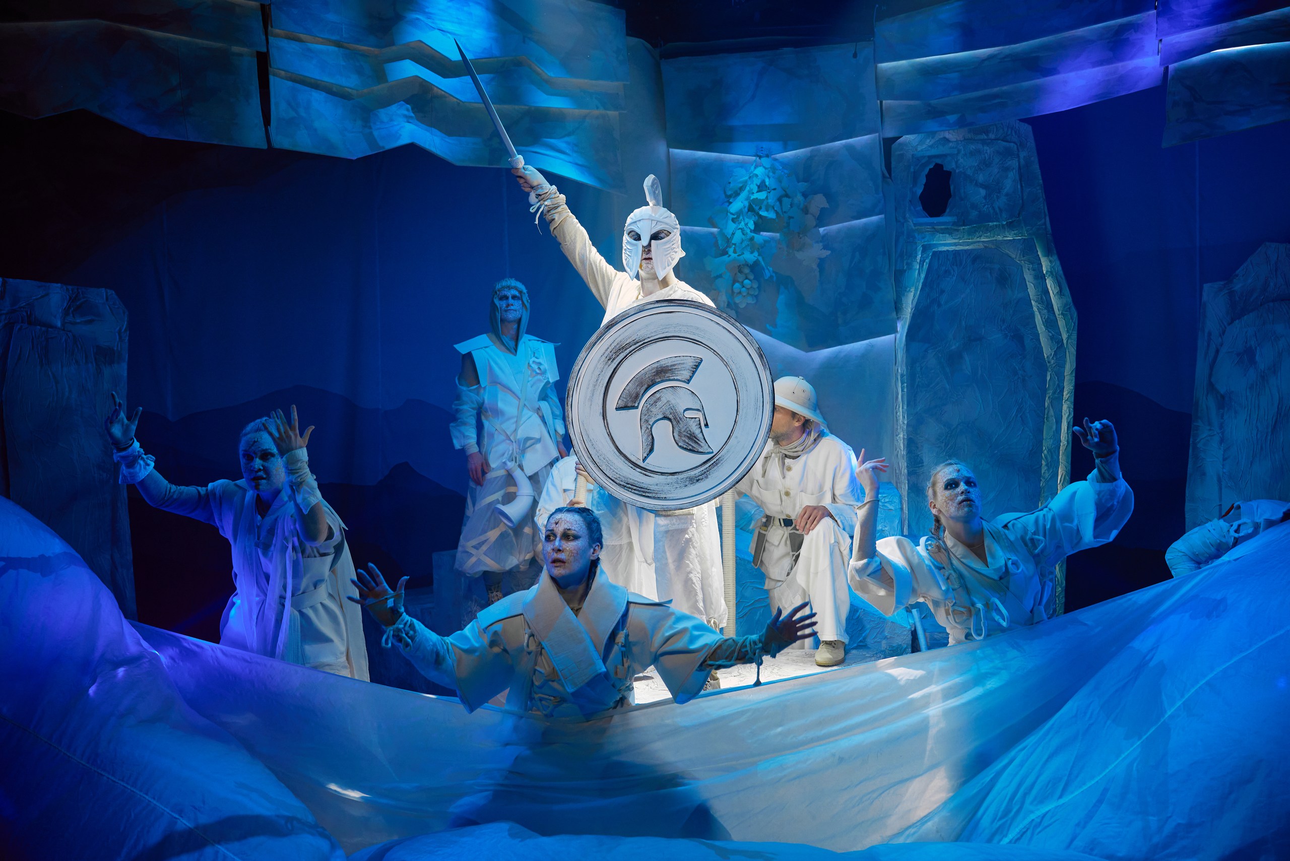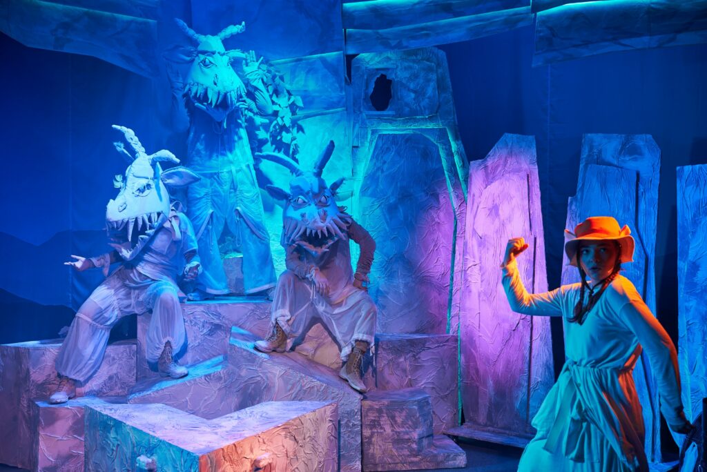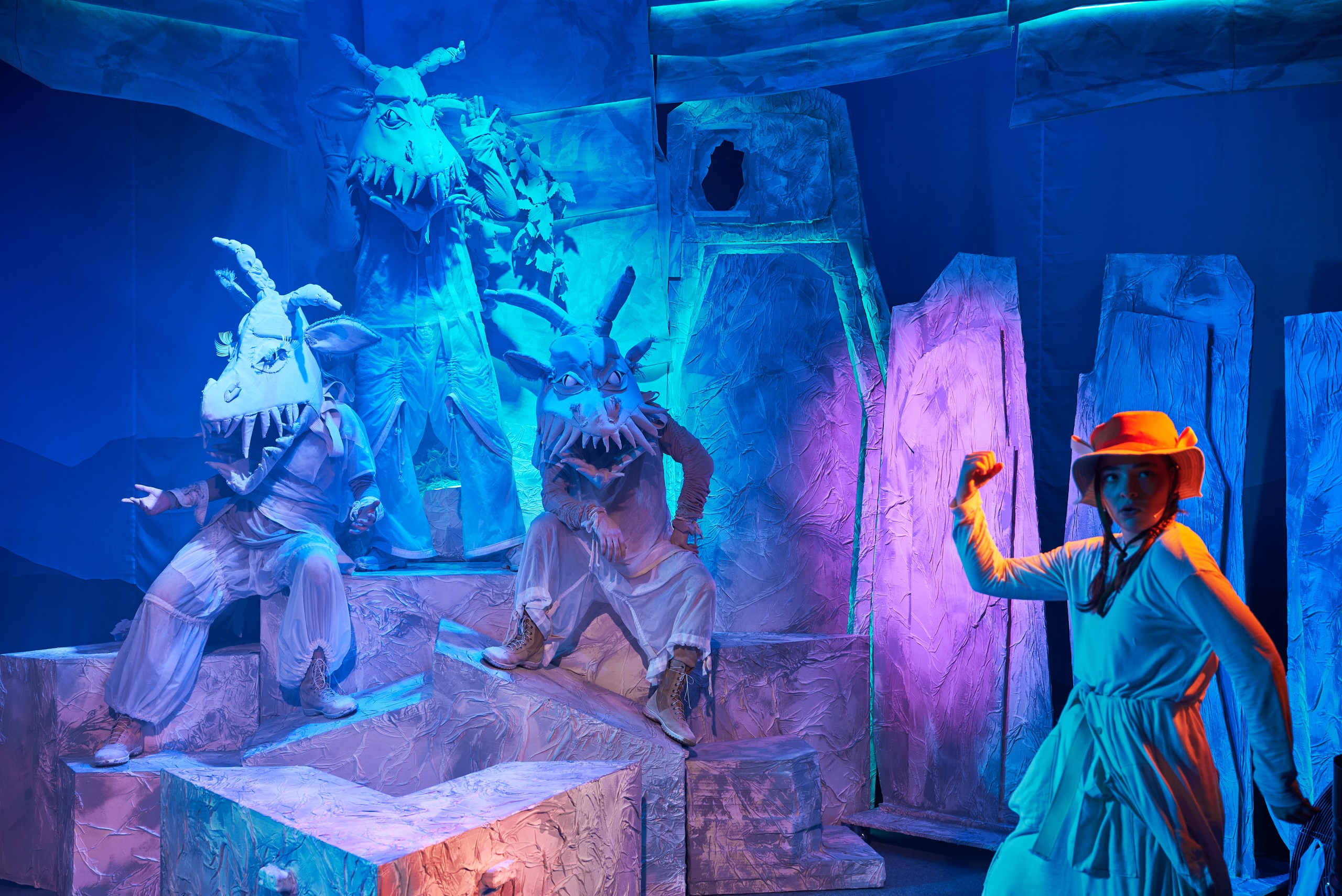 — камнепад, который обрушивают на героев разгневанные духи гор — огромные булыжники летят в зал, но никто не пострадает, ведь это театр.